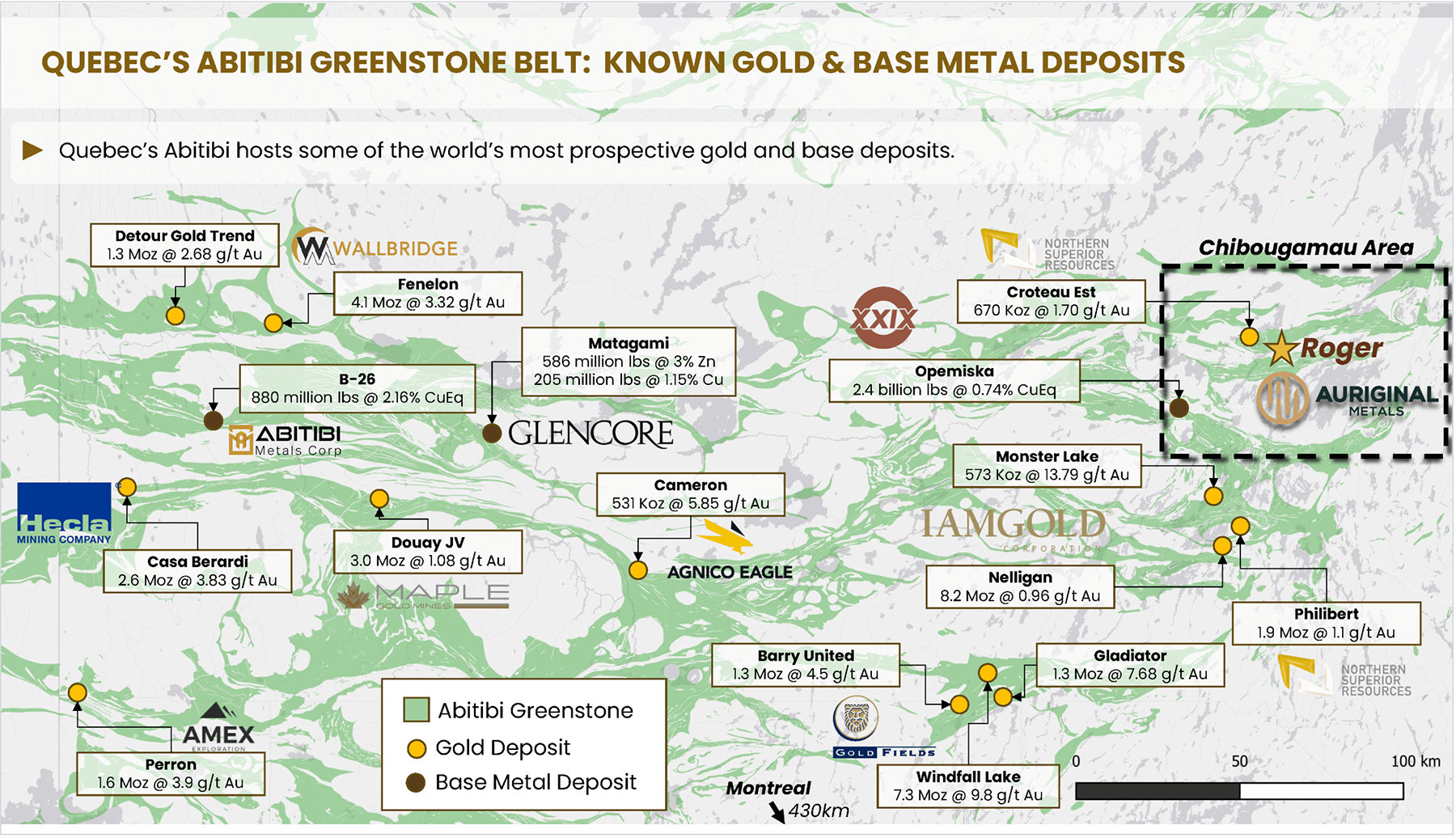 Roger est voisin de gisements majeurs, dont le gisement Croteau Est de Northern Superior (NSUP.v) au nord, qui contient une ressource présumée conforme au 43-101 de 640 000 onces d’or. Roger est également contigu au projet Gwillim de Dore Copper Mining Corp. (DCMD.v) (Cynagus Metals (CY5.AX)), situé à l’ouest.