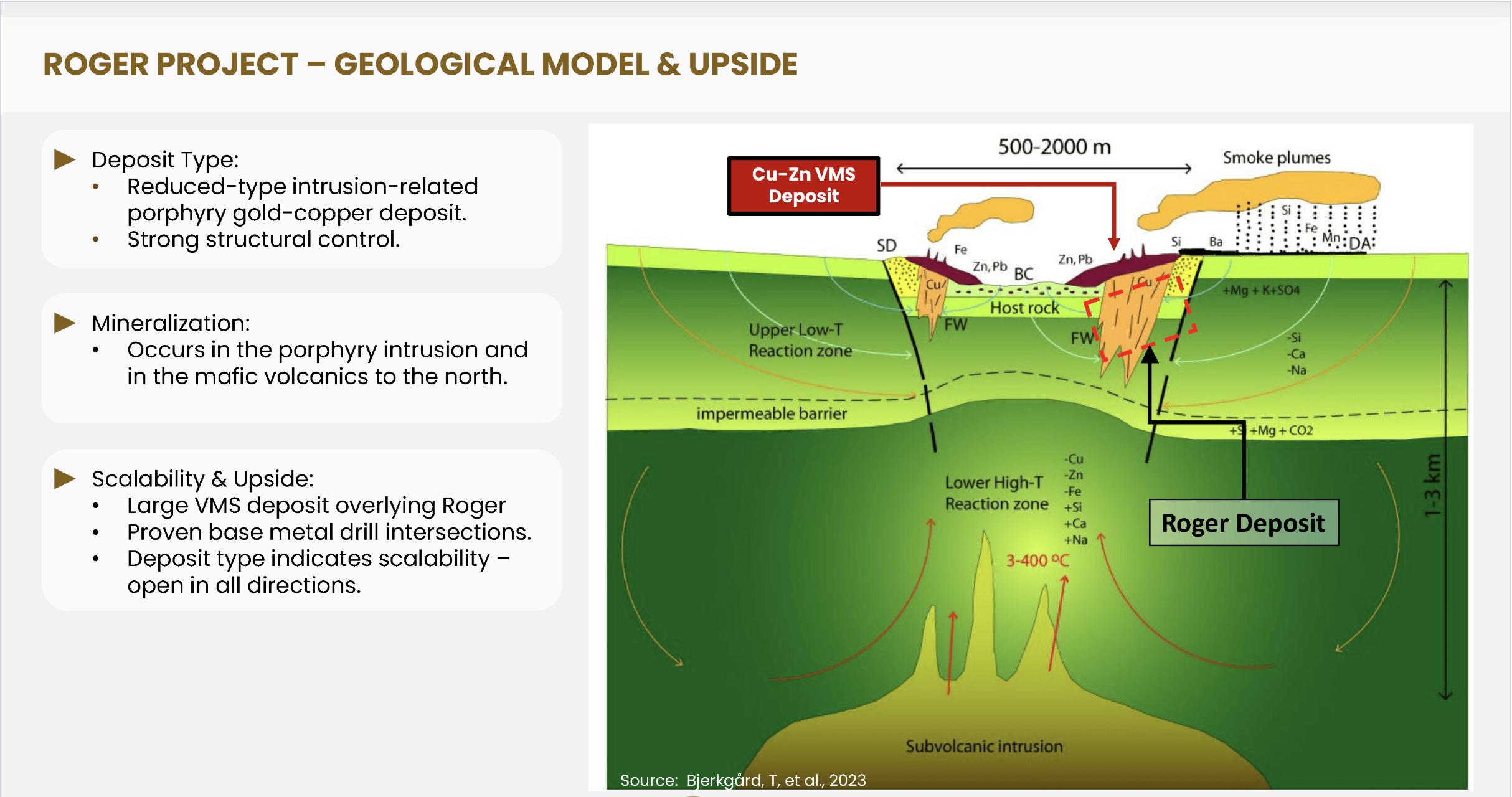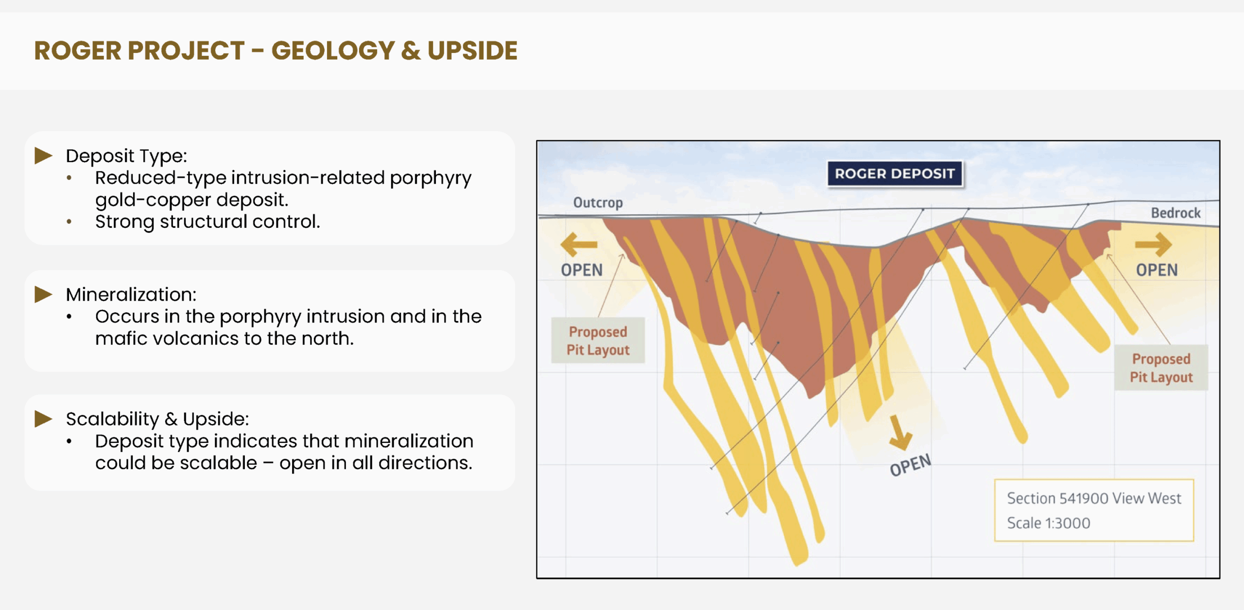 Le projet est un projet d’exploration à un stade avancé, ayant fait l’objet de plusieurs campagnes de forage totalisant 58 000 mètres. De plus, des travaux souterrains réalisés en 1988 comprenaient 1 177 mètres de développement, 1 433 mètres de forage souterrain et plus de 1 000 mètres d’échantillonnage en rainures. Le gisement Roger est interprété comme un gisement porphyrique aurifère-cuprifère de type intrusion réduite, fortement contrôlé par la structure. La minéralisation se trouve à la fois dans l’intrusion porphyrique et dans les roches volcaniques mafiques au nord. Bien que plus de 500 000 onces équivalent or aient déjà été délimitées à Roger, le projet offre encore un potentiel important puisque le gisement demeure ouvert latéralement (à l’est et à l’ouest) ainsi qu’en profondeur.