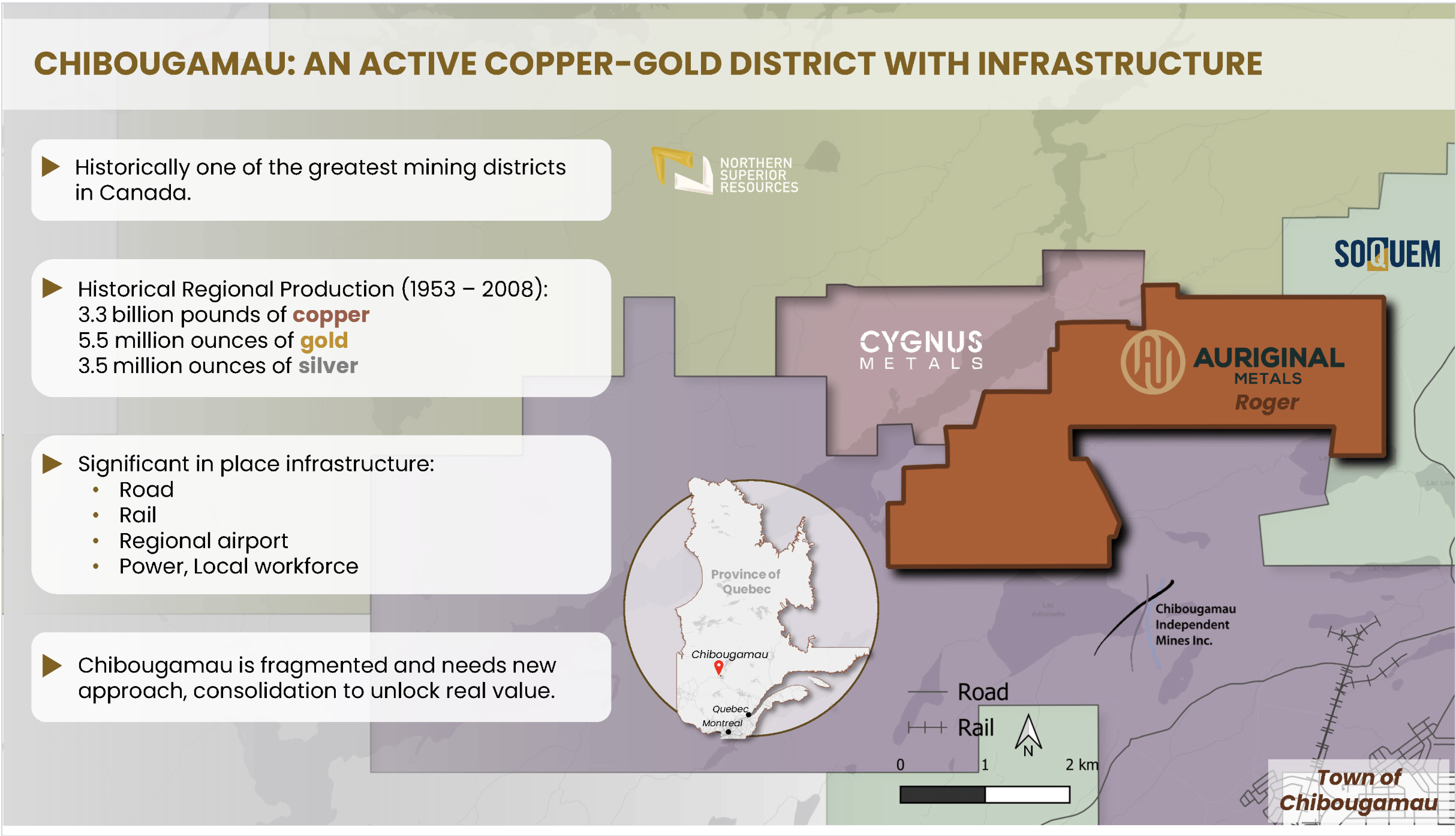 Chibougamau possède une riche histoire minière, avec de nombreuses mines en production dans un rayon de 15 km, incluant le projet Opemiska de la Société ainsi que les projets Cedar Bay, Devlin et Corner Bay de Cyngus Metals. La région de Chapais-Chibougamau a historiquement produit 1,6 million de tonnes de cuivre et environ 6 millions d’onces d’or entre 1953 et 2008.