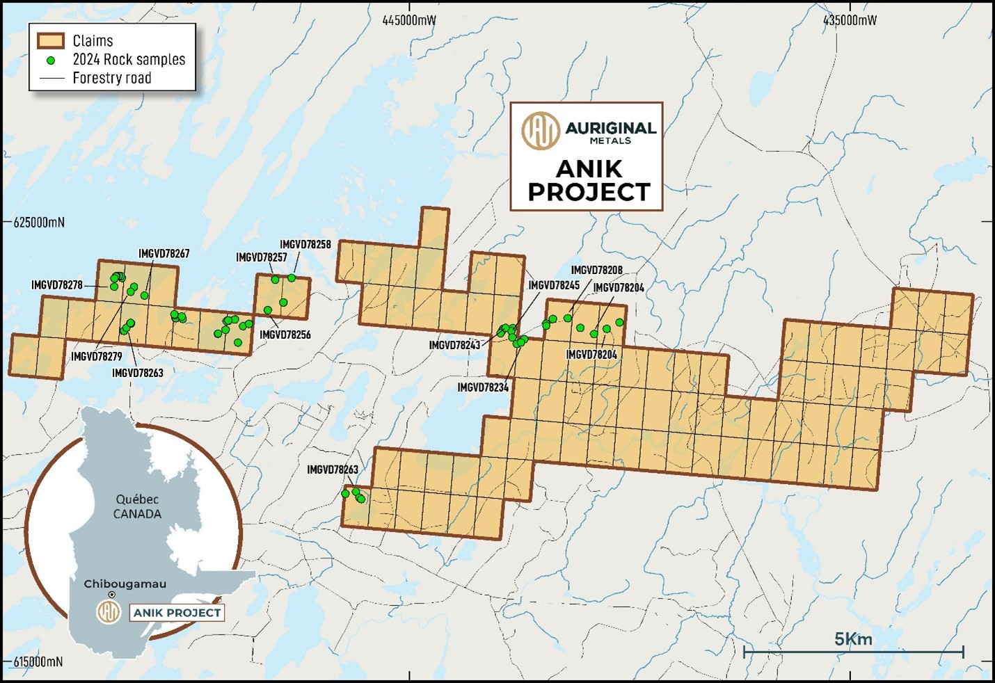 Aperçu : La propriété aurifère Anik est située à 40 km au sud-est de la ville de Chapais et à 55 km au sud de la ville de Chibougamau, au Québec. Le projet comprend 120 claims totalisant 6 700 hectares. Les villes voisines de Chapais, Chibougamau et Oujé-Bougoumou fournissent les infrastructures et la main-d’œuvre nécessaires pour l’exploration et le développement minier. Le projet Anik a été optionné par IAMGOLD en 2020, et un partenariat 75:25 a été formé avec Auriginal après avoir dépensé 4,0 millions de dollars en exploration sur la propriété et effectué des paiements en espèces de 600 000 $.