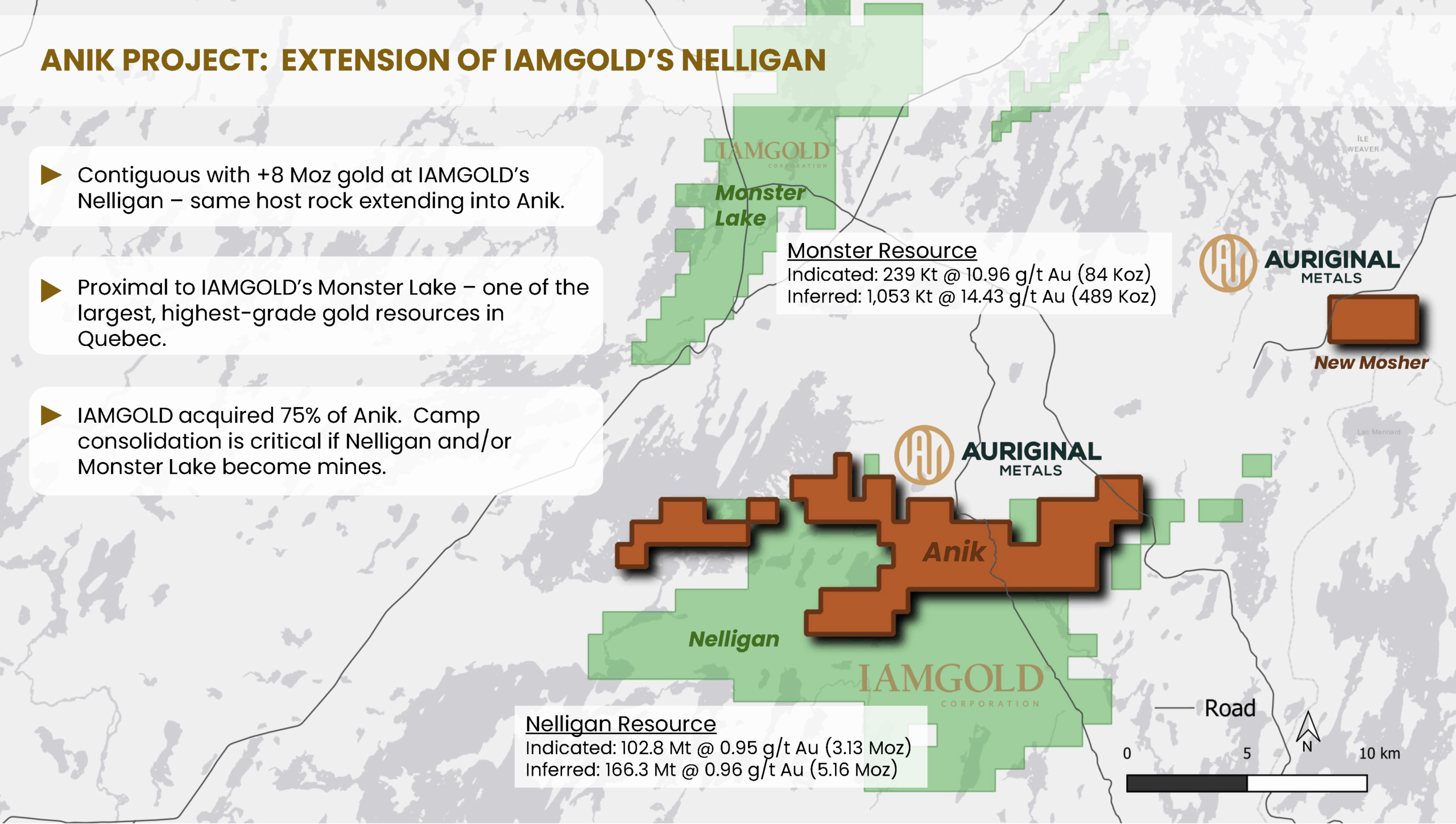 Localisation et infrastructures : La propriété est facilement accessible par des routes connectées aux villes voisines de Chapais et Chibougamau. Le bloc de claims sud-est est traversé par la ligne à haute tension d’Hydro-Québec. La portion est de la propriété se situe à moins de 7 km de la mine Joe Mann et des gisements Lac Meston et Phillibert. La portion ouest est située à moins de 10 km au sud des projets aurifères Monster Lake et Fancamp. De plus, les principales zones aurifères de la propriété Nelligan, un partenariat entre Vanstar Resources et IAMGOLD, sont entourées au nord, au sud et à l’est par les limites de la propriété Anik à une distance inférieure à 1 500 mètres.